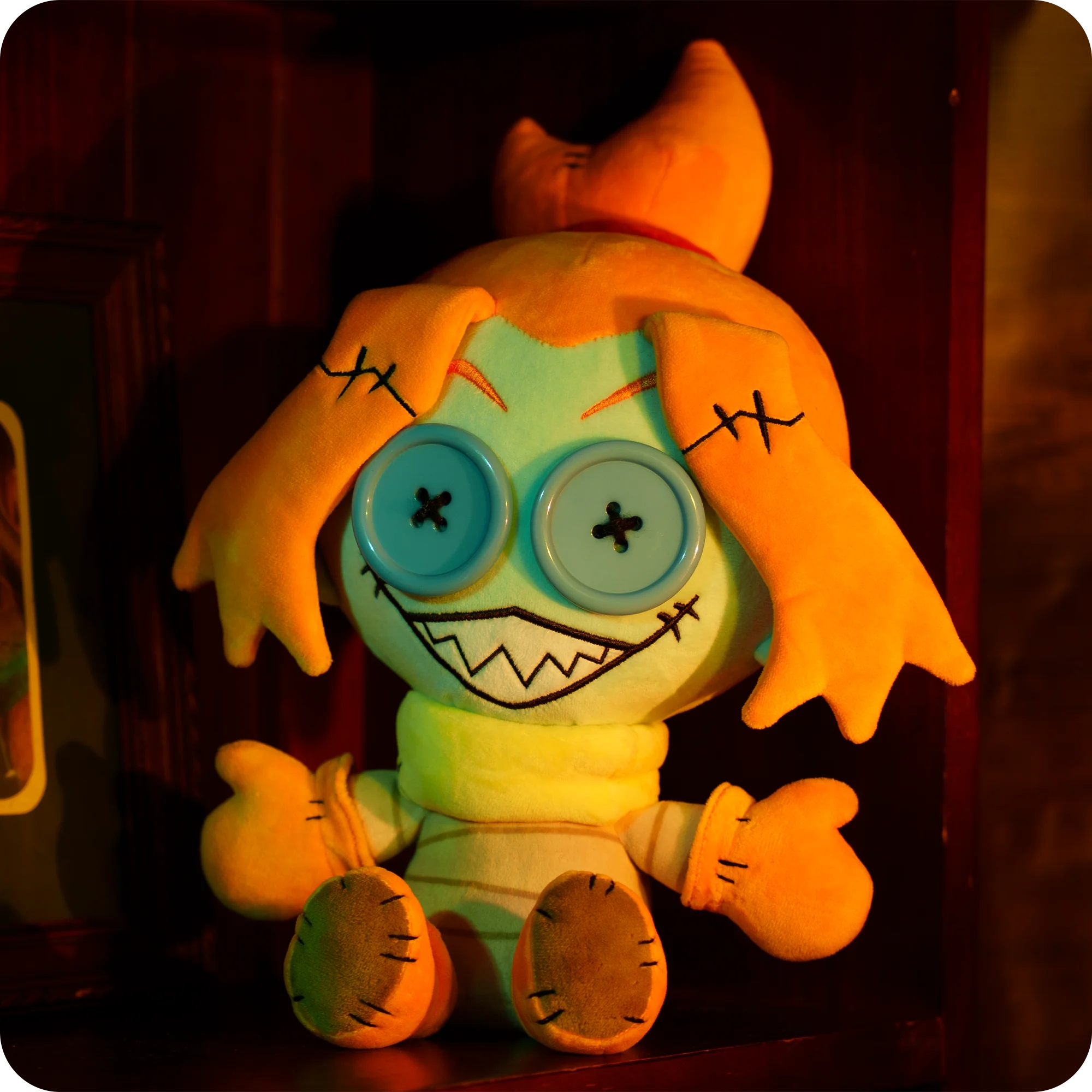 Just because her eyes are buttons, doesn't mean this Mel plush can't see you - she can, she just chooses not to.